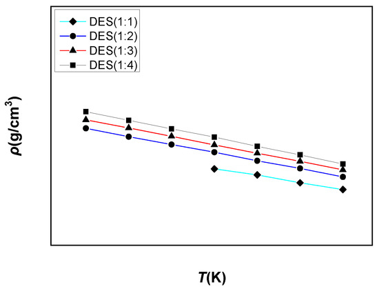 The density of DES(1:1–1:4) is measured under different temperatures (293.15–353.15 K) under atmospheric pressure. As DES(1:1) is not in the liquid state at room temperature, it is measured from 323.15 K (Figure 2). From the figure, it is inferred that within the temperature range of 293.15 to 353.15 K, the densities of the samples are found to cover the range between 1.04 and 1.12 g/cm3, which is close to the density of water, and also, the density tends to decrease with an increase in temperature. The obtained results follow the general liquid density characteristic. Further, with the increase in HBD content, the density increases.