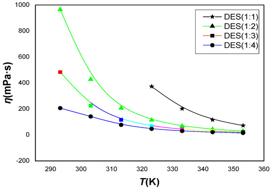 The change in experimental viscosity values of prepared DESs with temperature.
