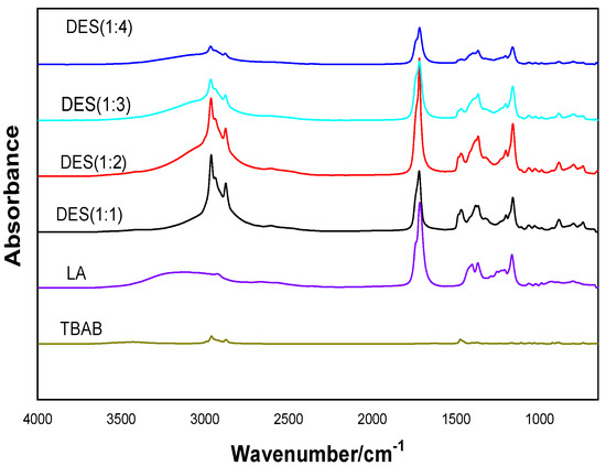 FT-IR spectra of LA, TBAB, and DESs formed by LA and TBAB with a 1:1–1:4 mol ratio.