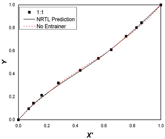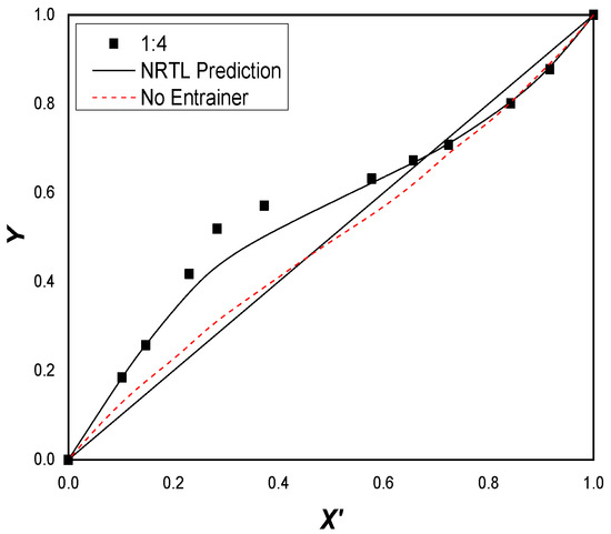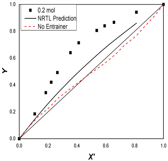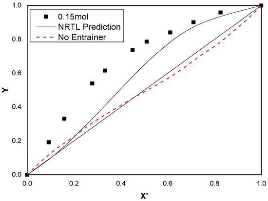 In most cases of DES(1:2) molar concentration, the NRTL model shows the best fitness. The coefficient of determination value (R2) follows the trend NRTL > UNIQUAC > Wilson in Table 10. The model regression results for different molar concentrations of DES(1:2) are shown in Figure 11, Figure 12, Figure 13 and Figure 14. The results depicted from the Figure 15 are also in accordance with the data of the relative volatility () in Table 11. In the system added with 0.1, 0.15, and 0.2 molar concentrations of DES(1:2), the azeotrope is broken. For each system, the two binary interaction parameters of cyclohexane/benzene through the NRTL model are obtained, which are shown in Table 11.