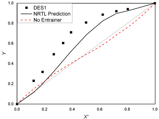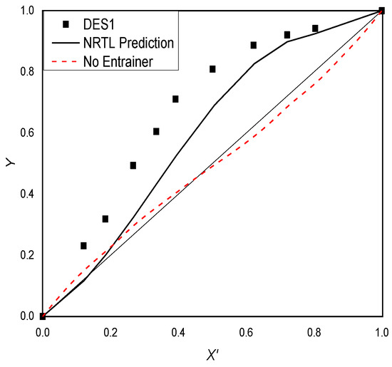 At the azeotropic point, the value of the relative volatility is found to be one, which means that both the components in the mixture have the same vapor pressure. As the boiling points of the two components are close to each other, the relative volatility of the two components can be increased by adding a low eutectic solvent. Table 7 and Figure 5, Figure 6, Figure 7 and Figure 8 depict that when the four DESs are added separately, as entrainers in a molar fraction of 0.1, only the relative volatility (aij) of the system added with DES(1:2) is higher than one at all concentrations, while the relative volatility of the other three systems is not higher than one at all concentrations. This phenomenon is attributed to the fact that the DES(1:2) breaks the azeotrope, whereas DES(1:1), DES(1:3), and DES(1:4) cannot break it. It also depicts the same results. The pseudo-ternary system added with DES(1:1) and DES(1:3) show the same azeotropic point as the binary system validating that the DES (TBAB:LA) (1:2) and DES (ChCl:LA) (1:2) have no influence on the azeotrope. Although the azeotropic point in the pseudo-ternary system added with DES(1:4) is changed to the cyclohexane side, the azeotrope is not broken. With these data, it is clear that only DES(1:2) acts as an effective entrainer in the present work.