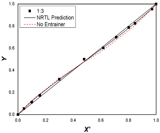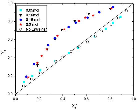 At the azeotropic point, the value of the relative volatility obtained will be one, which represents that both components in the mixture have the same vapor pressure. If the azeotrope is not broken, the relative volatility will be lower than one for all concentrations. However, if the azeotrope is broken, the relative volatility becomes higher than one at all concentrations. Table 9 and Figure 9 display that when the DESs are added as entrainers in a molar fraction of 0.05 to 0.2, the relative volatility () of the system with 0.1, 0.15, and 0.2 molar concentrations of DES(1:2) is higher than one at all concentrations, whereas the relative volatility of system with 0.05 molar concentration of DES is lower than one. Figure 10 also depicts the same result, where in the pseudo-ternary system with 0.1, 0.15, and 0.2 molar concentrations of DES(1:2), Y1 is greater than X1 in all concentrations and, therefore, validates that the azeotrope is broken.
