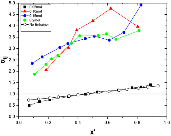 For a better understanding of the pseudo-ternary VLE behavior, both relative volatility (aij) and selectivity (S) are assessed using the following expressions: