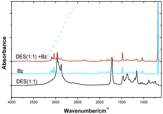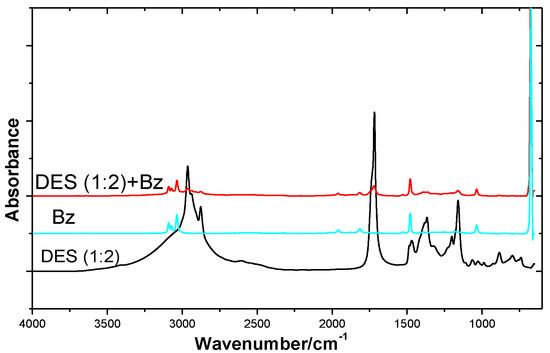 FT−IR spectra of DES(1:1), benzene and DES(1:1) + benzene(DES 0.1 (molar concentration)).
