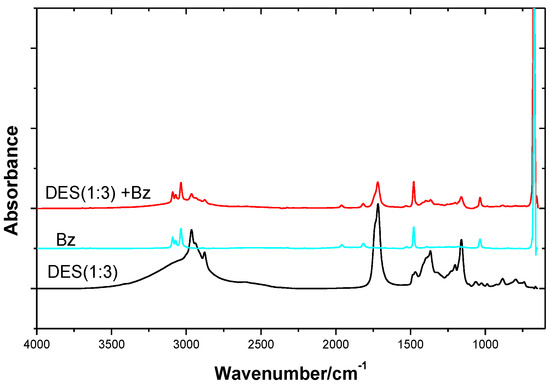 FT-IR spectra of DES(1:3), benzene and DES(1:3) + benzene(DES 0.1 (molar concentration)).