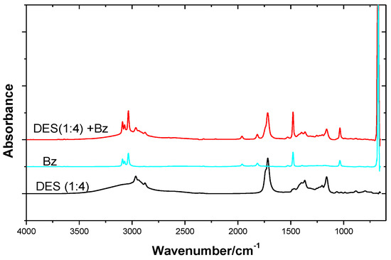 FT−IR spectra of DES(1:4), benzene and DES(1:4) + benzene(DES 0.1 (molar concentration)).