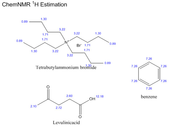 Since the change in concentration of the constituents cannot be exactly revealed by FT-IR analysis, NMR is employed in the selection of the DES concentration study. Using ChemDraw software, the magnetic resonance hydrogen spectrum of tetrabutylammonium bromide, levulinic acid, and benzene is simulated, and chemical shift values are obtained, as shown in Figure 19, Figure 20 and Figure 21. The experimental test of 1H NMR spectra and magnified view of a particular range are shown in Figure 22 and Figure 23. From Figure 21 and Figure 22, it is inferred that the NMR spectrum simulated from the ChemDraw software highly corroborates with the test measured spectra, confirming that the test samples are highly pure and they are target material.
