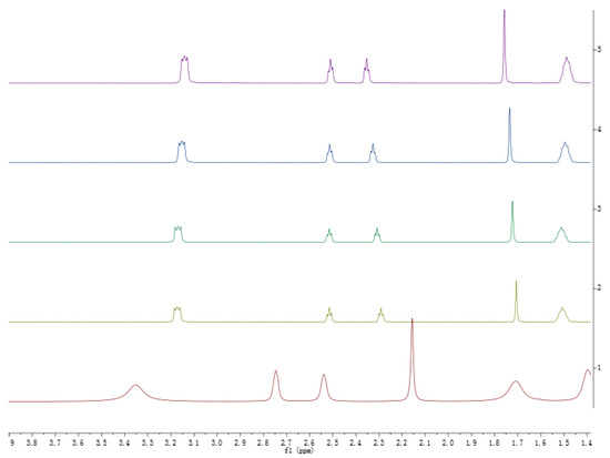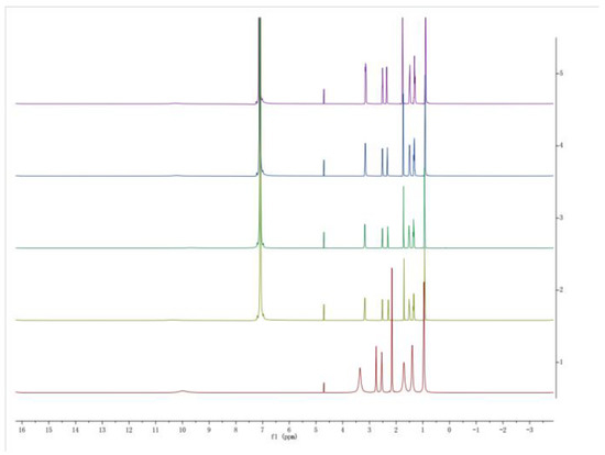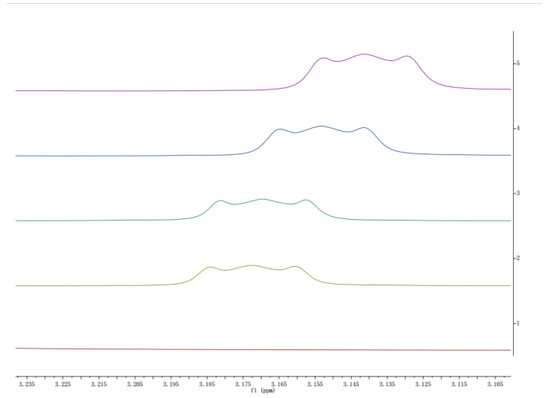 From the expanded spectra shown in Figure 22 and Figure 23, it is inferred that compared to pure DES(1:2), different concentrations of DES(1:2) all have apparent spectral peak shifts and are shifted towards the low field. This is ascribed to the formation of hydrogen bonds between different concentrations of DES(1:2) and benzene. As a result, the electron cloud density around the hydrogen nucleus has declined due to the induced effect. As can be seen from Figure 23, the chemical shift of spectral peak offset value is different for different concentrations of DES(1:2); the offset distance is positively correlated with the DES(1:2) concentration. This substantiates that the hydrogen bonding strength formed between different concentrations of DES(1:2) and benzene is different, and it is positively correlated with the concentration. From these interpretations of the NMR results, the vapor–liquid equilibrium results are verified, i.e., low concentrations of DES(1:2) cannot break the benzene-cyclohexane azeotrope, but high concentrations of DES can break the azeotrope.