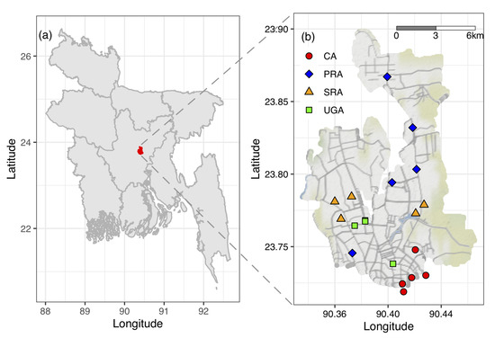(a) Location of the study site (Dhaka city; red marked area) in Bangladesh map, and (b) map of Dhaka metropolitan area with different land-use categories. CA = commercial area, PRA = planned residential area, SRA = spontaneous residential area, and UGA = urban green area.