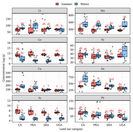 The sequences of the average metal concentrations for different land use during the winter season are as follows: Zn > Mn > Cu > Cr > Pb > Ni > Co > As (CA), Mn > Zn > Cu > Cr > Pb > Ni > Co > As (PRA), Mn > Zn > Cu > Cr > Pb > Ni > Co > As (SRA), and Mn > Zn > Cu > Cr > Ni > Pb > Co > As (UGA). During the summer season, the sequences are as follows: Mn > Zn > Cu > Pb > Cr > Ni > Co > As (CA), Zn > Mn > Cu > Cr > Pb > Co > As (PRA), Mn > Zn > Pb > Cu > Cr > Ni > Co > As (SRA), and Mn > Zn > Cu > Cr > Pb > Ni > Co > As (UGA). These sequences of metal concentrations in selected land-use types indicate that Mn, Zn, and Cu were prominent in all land-use categories in both seasons, whereas the presence of Co and As was scarce. Arsenic, in particular, was the lowest among the studied heavy metals. The mean concentrations of most of the heavy metals studied here showed increased values in the winter season due to the long antecedent dry weather periods (ADP). It was reported that ADP could increase pollution levels of Zn and Cu in road-deposited sediments [26]. The reason behind the lower concentration level of heavy metals in the summer season is the rainfall, which flushes out the roadside dust and prevents the heavy metals from becoming accumulated. Moreover, there are many festivals, such as the Book Fair and Trade Fair that are held in the winter seasons in Dhaka City. The number of private and public vehicles increases in some other occasions (e.g., National Days, such as 16 December, 21 February, 26 March). Thus, higher concentrations of heavy metals may accumulate in the roadside dust during the winter season as compared to the summer season.
