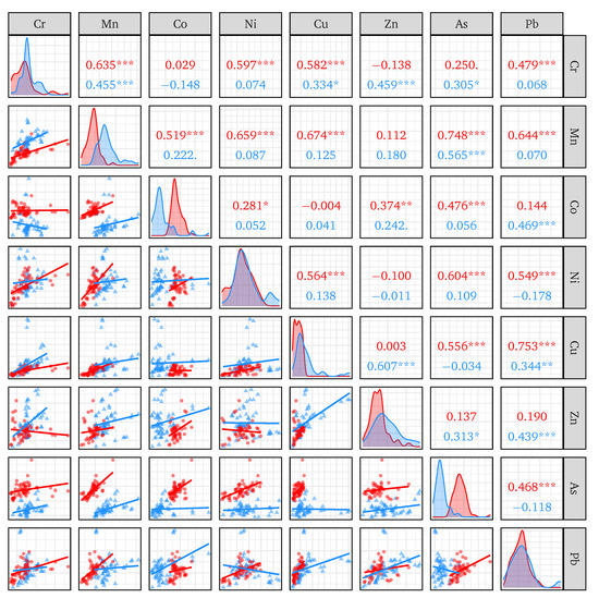 Correlation matrix of heavy metal concentrations in roadside dust of Dhaka City of Bangladesh. The values in the upper and lower matrices are Spearman’s rank correlation co-efficient () and metal concentrations, respectively. Red and blue colors represent summer and winter seasons, respectively. Spearman’s rank correlation co-efficient values () with *, **, and *** denoting significant at 95%, 99%, and <99% levels of significance. The diagonal matrix (density plots) shows the distribution of data.