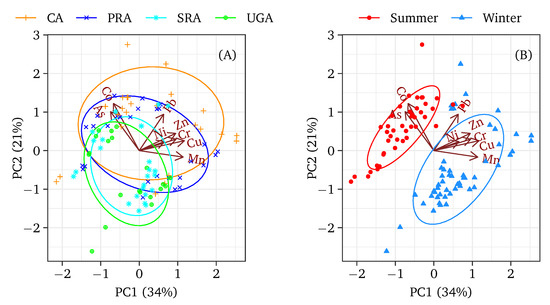Principal component analysis (PCA) of heavy metal contamination of roadside dust in Dhaka city based on (A) land use category, and (B) season. CA = commercial area, PRA = planned residential area, SRA = spontaneous residential area, and UGA = urban green area.