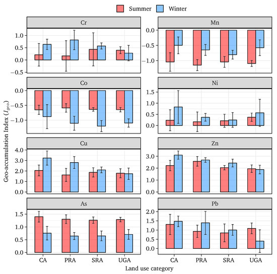 The values for heavy metals in roadside dust from different land-use areas of Dhaka City are presented in Figure 5. The for Mn and Co in all land-use types in both sampling seasons was similar to the uncontaminated class. This result agrees with the finding of [65]. In the other words, the roadside dust of Dhaka City in different land-use areas during the winter and summer seasons was contaminated ( 0) by heavy metals, such as Cr, Ni, Cu, Zn, As, and Pb (especially Cu and Zn) to some degree, which probably originated from anthropogenic sources. However, Mn and Co did not correspond to the roadside dust contaminants in the study areas and are likely from a natural origin. The for Cr and Ni was ranked ‘uncontaminated to moderately contaminated’ during the summer and winter seasons for all land-use types. The values of Cu and Zn in both sampling seasons and all land-use types ranged from moderately contaminated to heavily contaminated, which were higher than the other studied metals. Only As had a higher during summer than winter for all land-use types. During the summer season, it was under the ‘moderately contaminated’ class, whereas in winter, it fell under the ‘uncontaminated’ to ‘moderately contaminated’ class. The highest found for Cu was during the winter season for CA, which fell under the ‘heavily contaminated’ class. The maximum was 4.5 in CA, which was similar to that in other studies [15,57]. In UGA, the values were found to be higher during the summer season for Cr, Cu, Zn, and Pb. Based on , CA during the winter season was ‘heavily contaminated’ ( > 3) with respect to Cu and Zn, while other land-use areas were ‘moderately contaminated’ to ‘moderately to heavily contaminated’ during the summer and winter seasons. This can be associated with the socio-economic activities that take place in the commercial areas, whereas there is a lack of protocols for proper waste management and disposal of materials, such as oils, greases, paints, fuels, metal filings, and used tires. The high contamination by Cu and Zn was alarming, which was mostly generated from multiple sources, including non-exhaust vehicle emissions, brake pads, tires particles, paints, electroplating, and roadside auto mobile shops.
