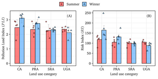 The contamination factor of heavy metals in the roadside dust of Dhaka City was evaluated and is presented in Table 2. On the basis of classification, Mn and Co were ranked as low contamination ( < 1) with the exception of Mn in CA and UGA for the winter season, where it fell in the moderate contamination class (1 < < 3). Chromium (Cr) and Ni were in the moderate contamination class for all land-use types and during both sampling seasons (except for Cr during winter and Ni in CA). The contamination factor of As was considerable contamination during the summer season and moderate contamination during the winter season for all land-use types. For both seasons, Zn was classified in the very high contamination ( > 6) class for CA, planned PRA, and SRA, whereas in UGA, it was categorized in the considerable contamination class. The maximum mean CF found for Cu (15.9) was in CA, followed by PRA (11.3) and SRA (6.5) during the winter season, which were ranked in the very high contamination group. Moreover, the CF of Cu was also categorized in the considerable contamination class during the summer season for PRA, SRA, and UGA. The contamination factor of Pb ranged the from moderate (1 < < 3) to considerable (3 < < 6) contamination group, where the highest (6.89) CF was found during the summer season for SRA. The pollution load index () for different sites is shown in Figure 6A. The highest value of was found in CA during the winter season, and the lowest value was found in UGA during the winter season. Nevertheless, since the values were higher than 1 in both seasons, all of the studied land-use categories were polluted [66].