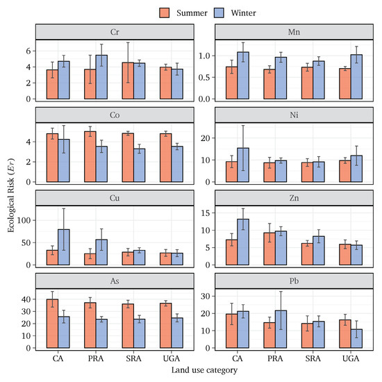 The potential ecological risk index () was calculated to assess the pollution by multiple heavy metals in urban roadside dust (Figure 6B). During the winter season, the highest ecological risk was found in CA followed by PRA, SRA, and UGA, whereas CA was found to have a moderate ecological risk ( = 157). The other three land-use areas were in the low ecological risk group. During the summer season, CA had the maximum ecological risk followed by UGA, PRA and SRA, but they were all in the low ecological risk category. During winter season, Cu was the highest contributors (30–48%) to the followed by As (15–28%) and Pb(12–16%). During summer season, the highest contribution to came from As (33–35%) followed by Cu (23–28%) and Pb (14–16%). Thus, these heavy metals (Cu, As and Pb) pose a potentially risk to the local ecosystem. Therefore, based on ecological-risk index method, Cu and As appeared as the priority pollutants in the study area in winter and summer season, respectively. Aminiyan et al. [68] reported Cu as the dominant pollutant in the Rafsanjan region in Iran. The result also showed that CA and PRA are two obvious high-RI sites in the studied area, which coincide with the highest metal concentrations. The CA sampling points had the highest load of vehicular traffic, which caused a notable increase in traffic-related pollutant generation. Several authors have also reported that commercial activities are the highest contributor to [15,69]. It should be noted that the risk index varies widely depending on how many elements are considered in the study. This demonstrates the importance of carefully reviewing the study parameters and choosing what elements to include or exclude [62].