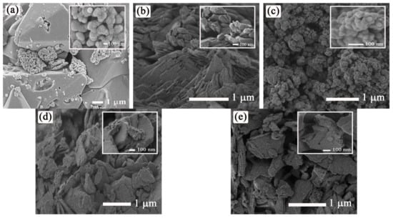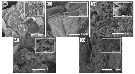Figure 3 and Figure 4 show SEM images of all obtained samples calcined at 500 °C (Figure 3) and 700 °C (Figure 4), respectively. The morphology of the nanoparticles loses uniformity during the synthesis process, which is consistent with the differences in intensities observed on XRD (Figure 1).