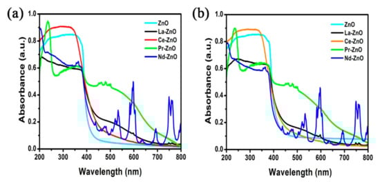 UV–Vis DRS of ZnO and M-ZnO (M = La3+, Ce3+, Pr3+ and Nd3+) nanoparticles: (a) calcined to 500 °C and (b) calcined to 700 °C.