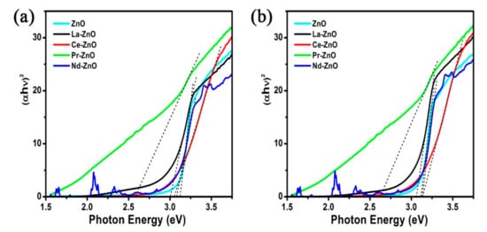 where α, Eg and A are the absorption coefficient, bandgap and material parameter, respectively. Extrapolation of the linear region of (αhv)2 vs. hv plots (Figure 6) provides the bandgap for the investigated nanoparticles calcined at 500 and 700 °C. The calculated bandgap values are shown in Figure 6 and Table 4. As observed, the presence of secondary phases does not make a direct contribution to the bandgap of the samples compared with ZnO. As can be seen in Figure 1, the peaks of the secondary phases are quite noticeable, so it would be expected to observe contribution from such impurities as LaOCl (Eg = 5.53 eV) [41] in the La-ZnO samples and the CeO2 (Eg = 3.71 eV) [42] in Ce-ZnO samples; the bandgaps of Pr12O22, PrOCl and NdOCl have not been found in the literature. In the obtained materials, a decrease in the bandgap of undoped ZnO (3.12 eV) is observed (with the exception of Ce-ZnO and Nd-ZnO, calcined at 700 °C). This decrease can be explained by charge transfer between electrons of the 4f level of RE ions and the conduction band of ZnO [43,44].