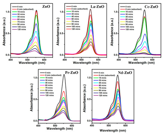 Photocatalytic reaction consists in the generation of an electron–hole pair by semiconductor nanoparticles by applying photons with an energy exceeding the bandgap of the material under study, while an electron of the valence band is excited into the conduction band, migrating to the surface of the particle. These charge-carrying species can react with absorbed molecules, as is the case of RhB. One of the factors that can affect the degradation of the dye is pH, since pH affects not only the surface properties of ZnO but also the dissociation of dye molecules and the formation of hydroxyl radicals. Under acidic conditions, the perhydroxyl radical can form hydrogen peroxide, which in turn gives rise to the hydroxyl radical [45]. Experiments previous to those reported here were carried out using only UV light and photocatalyst. Observed is that the RhB degrades very slowly. AlHamedi et al. investigated that using H2O2 in the presence of UV light increases the generation of hydroxyl radicals, causing discoloration of the solution [46]. For this reason, it was decided to carry out the degradation reactions of RhB at pH 3 and use H2O2. RhB is a typical pollutant in the wastewater of the textile industry. Degradation of RhB was studied in the presence of nanoparticles of all prepared calcined at 500 °C and 700 °C in the presence of H2O2 under UV–Vis light irradiation for a period of 120 min. Figure 7 and Figure 8 show the time-varying UV–Vis spectra of the RhB dye in the presence of nanoparticles of all catalysts under study, calcined to 500 °C (Figure 7) and to 700 °C (Figure 8), respectively, in the reaction mixture, upon irradiation with UV–Vis light for a period of 120 min. Spectra show the maximum absorption wavelength at ~554 nm. RhB absorbance intensities gradually decrease with increasing exposure time, indicating a decrease in the RhB dye concentration.