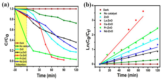 3.2. Photocatalytic Activity of ZnO and M-ZnO (M = La3+, Ce3+, Pr3+ and Nd3+) Nanoparticles