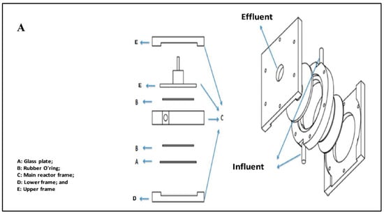 The photodegradation experiments were performed in a swirl-flow reactor. The reactor is composed of a circular frame made of stainless steel and aluminum except for the reactor’s bottom, where a circular glass plate exists inside the frame. Two rubber O-rings are placed inside the reactor frame at the lower and upper sides of the circular glass plate to protect its vessel from leaks. The reactor is unique in its type due to two-reactor inlets that lead to numerous advantages. Its design allows for providing a high ratio of catalyst surface area to reactor volume; effectively deals with high flow rates with minimum pressure drop values; allows for selection flexibility between suspended and supported catalyst modes; and efficiently evaluates the degradation kinetics concerning different parameters such as liquid flow rate, dye concentration, catalyst loading and light intensity. The photoreactor layout and its details are displayed in Figure 2A. The experimental setup used for the experiments is shown in Figure 2B.