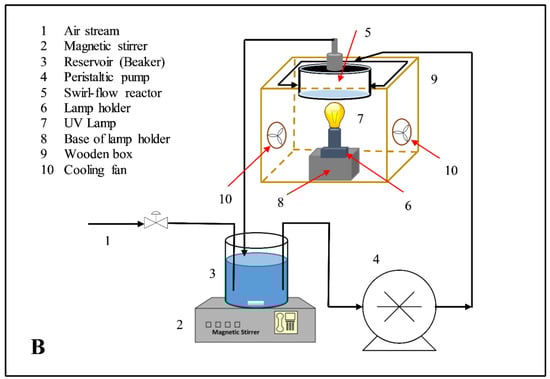 (A) The design layout of the swirl flow photoreactor and (B) A schematic representation of the experimental setup.