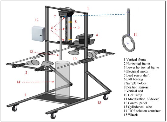 The dip-coating apparatus consists of a vertical structural frame connected to two horizontal frames and a horizontal plate. An electrical motor (Leeson Electric Corporation, WI, USA) with 1 H.P. is placed on the horizontal plate and connected to a lead screw shaft (threaded screw rod) mounted on a ball-bearing at both ends. The screw shaft is vertically positioned between the vertical frame and horizontal plate and fixed using small pins. A sample holder is mounted on the screw shaft using a ball bearing, which conveys through the shaft’s level limits. The upper and lower limits of the sample holder, cycle limits, are determined using two position sensors placed on a vertical rod located beside the screw shaft. The position of the mentioned sensors can be adjusted based on the cycle level requirements. Under the horizontal plate, a movable horizontal frame includes four heat lamps (175 W, Philips, Markham, ON, Canada) distributed in different directions; thus, the horizontal plate’s height can be adjusted. Additionally, the position of the heat lamps can be relocated according to the coating requirements. The lower horizontal frame includes four wheels so that the device can be moved easily between different places. The purpose of this frame is to provide support for the device. The dip-coating device was built by the University Machine Shop (UMS) previously used by our group (e.g., [28]) and was initially designed for tube coating. Therefore, the device is modified before it is used in the circular glass coating. The modification includes a cylindrical shaft connected to a circular frame. The rod well fits the sample holder of the device while the circular glass is placed on the circular frame and is fixed by four small nuts and bolts. The details of the dip-coating device and its modification are presented in Figure 3 [35].