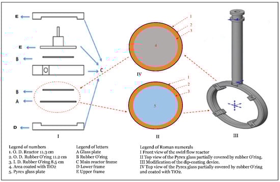 It is important to mention that the swirl flow reactor includes two rubber O-rings on both sides of the reactor housing to seal the reactor from any possible leakage. The presence of those O-rings leads to cover circular parts of the glass and create a shaded area on both sides of the reactor frame because of cutting off the emitted light from the lamp. Thus, it is assumed that there are no sufficient photoreactions over the created shaded area compared to uncovered areas. Based on this, reducing the coating area to the actual area of those O-rings is quite reasonable to maximize the light distribution per the coated area and lower the related cost of TiO2 amount reduction. To achieve this objective, a similar rubber O-ring is placed on the modified circular frame of the dip-coating device during the coating process to simulate the reactor during its normal operation. A schematic diagram of the approach used for the Pyrex glass coating is presented in Figure 4. Additionally, one face of the circular frame was covered using parafilm and heat tape as the coating of one glass face is required. For the same reason, two heat lamps instead of four lamps were used for quick drying during the coating process.