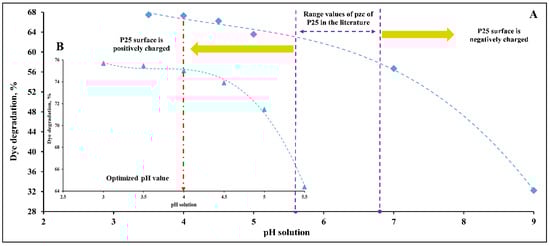 The behavior of DB15 degradation within a wide range of pH values is displayed in Figure 5A,B. As shown in Figure 5A, a low degradation rate is observed at pH 9 (pH higher than pzc range values). This outcome is mainly due to a repulsive force between the negatively charged Degussa surface and anionic DB15 dye that includes four negative sulfonate groups. Such a repulsive force leads to adsorb little amounts of DB15 on the P25 catalyst surface, subsequently a lowered removal rate. As the pH values decrease and become lower than pzc range values, the DB15 removal is increased. This behavior is explained by the presence of a strong attractive force between anionic DB15 and the positively charged Degussa surface, which results in the adsorption of large amounts of DB15 on the catalyst surface. Hence, the degradation rate is then increased.