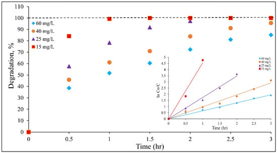 It is known that the concentration of a pollutant has a big effect on the wastewater treatment process. Thus, it is important to evaluate the influence of initial dye concentration on the degradation kinetics [40]. At low dye concentrations, the integration of Equation (1) leads to a pseudo first-order kinetics reaction [13,15,17].