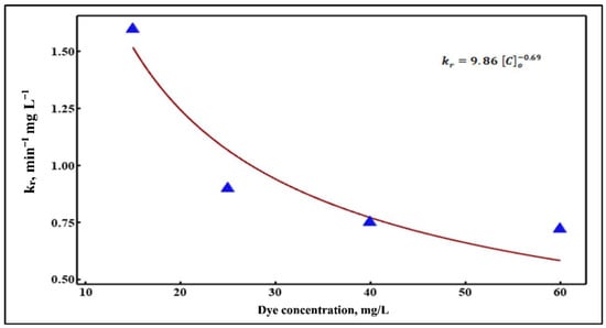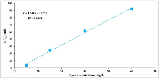 The concept of this approach is mainly built on finding individual values for both and constants [17,42]. Hence, this path is more specific than the previous approach in terms of evaluating the required constants. With Equation (6), the plot of values vs. different concentrations results in achieving the dye concentration-dependent equation as shown in Figure 7. From the mentioned figure, the equation’s slope and intercept are obtained, equivalent to and . Hence, the and were determined, and their values were 0.574 min−1 mg L−1 and 0.165 L mg−1, respectively. In the current case, dye concentration changed from 15 to 60 mg L−1. Therefore, the path completely ignores the influence of different factors on the mentioned constants, resulting in a considerable deficit in its validity and reliability.