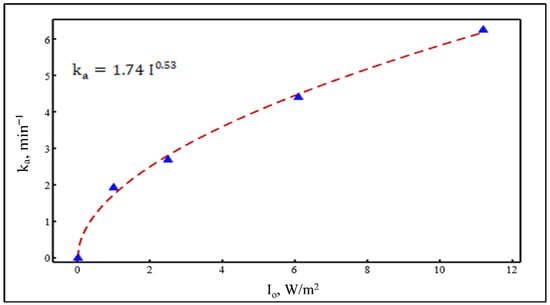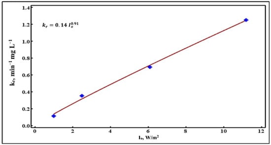 The plotting of the obtained values (Table 4) vs. different catalyst loadings leads to obtaining the catalyst loading-dependent equation. Similarly, the light intensity-dependent equation is achieved by plotting their values (Table 5) vs. various light intensities. With the application of non-linear regression using the MINITAB 19 software package (Version 19.2020.1) (Minitab, LLC, State College, PA, USA), the best-fit equations of these values are then determined. The actual values and their best-fit equations for the range of catalyst loadings and light intensities are presented in Figure 9 and Figure 10, respectively. The best-fit equations of as a function of catalyst loading and light intensity are displayed in Equations (16) and (17), respectively.