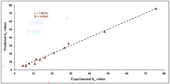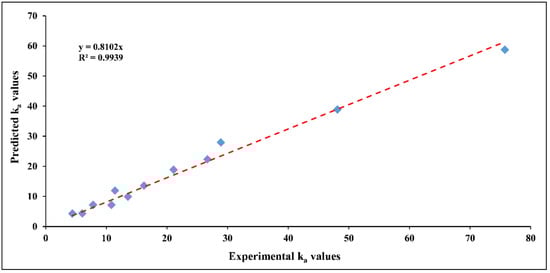 To examine the model’s validity, a comparison between experimental and predicted ka values for all obtained data is evaluated in Figure 11. The predicted values are determined using the developed model equation, while the observed values are obtained from the experimental results. As shown in Figure 11, it is noted that the model data trends to fitting well the results of kinetics experiments, indicating a good agreement between both theoretical and practical sides. Based on the above, the developed model is quite reasonable in reflecting the extent of experimental observations, referring to achieving good credibility.