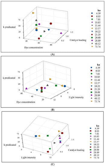 As mentioned earlier, the DB15 degradation fits well with the pseudo first order kinetic model ( model). Based on Table 1, appears to be a function of three independent variables: dye concentration, catalyst loading, and light intensity. Thus, an empirical model could be developed to examine the impact of the mentioned independent variables on , reflecting the entire experimental data. With the use of non-linear regression analysis, an empirical kinetic model expressed as a power-law equation was developed, as shown in Equation (19).