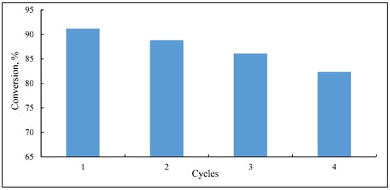 The reusability test is considered of great importance for immobilized photocatalysts. Thus, a group of experiments were carried out at the same operating conditions to evaluate the extent of catalyst reusability. The recyclability was examined for up to four cycles, and the findings are displayed in Figure 18. As can be seen, there was no significant change, only 2.6%, in the catalyst activity after the second cycle. Compared to the original activity, the third cycle shows the catalyst activity reduced by 5.6%. After the fourth cycle, it appears that the catalyst lost 9.71% of its activity, registering a higher loss of activity. In this cycle, the DB15 degradation removal was reduced to 82.33% from 91.18% for the first use. The obtained results indicated that the immobilized catalyst possesses high reusability. However, the loss of catalyst activity could be explained by two reasons. The catalyst loses some of its particles over the cycles, and the catalyst washing after cycles. The second reason is catalyst surface contamination. Some dye molecules could be accumulated over the cycles that could compete with the following experiments’ molecules for the limited active sites of the catalyst surface, resulting in a reduction in catalyst activity [47].