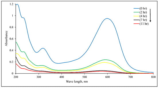More importantly, because getting higher removal rates is desirable, lower pH is preferred, more specifically, the pH values below the pzc point (value of 5.6). This ensures a strong attractive force that leads to the adsorption of large amounts and, subsequently, more dye degradation. Therefore, Figure 5B focuses on the pH values that ranged between 3 and 5.5. Interestingly, a similar trend is registered for DB15 degradation though different dye concentration was used. According to this discussion, the value of pH 4 was selected as the optimal value for the experiments of degradation kinetics. Further details can be found in [37].