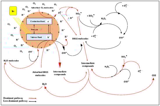 With respect to direct dye reduction, pH is considered a significant factor because of its major role in the reductive cleavage of azo bonds at low pH values [15]. As part of the direct dye oxidation mechanism, the generated positive holes directly react with the DB15 to produce intermediate compounds that mineralize to CO2 and H2O eventually as final products of the oxidation process, as presented in Equation (28). The general mechanism of DB15 degradation at a low pH value is displayed in Figure 20 [28].