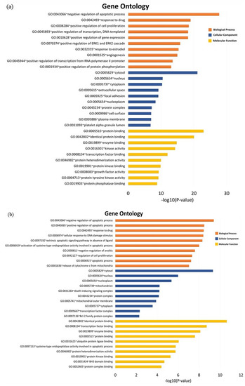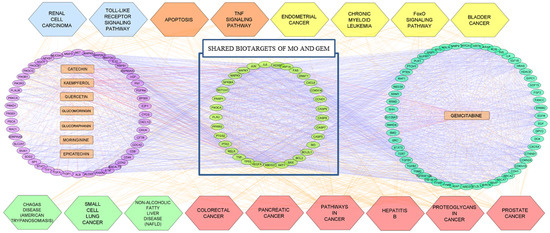 The target genes of MO bioactive compounds and GEM were retrieved from the three databases, which are Drugbank (https://go.drugbank.com/, (accessed on 17 December 2020)) [15], The Drug Gene Interaction Database, DgIdb (https://www.dgidb.org/, (accessed on 17 December 2020)) [16], and Comparative Toxicogenomics Database, CTD (http://ctdbase.org/, (accessed on 17 December 2020)) [17]. All the target genes were limited to Homo sapiens only, and duplicated target genes were removed from the list.