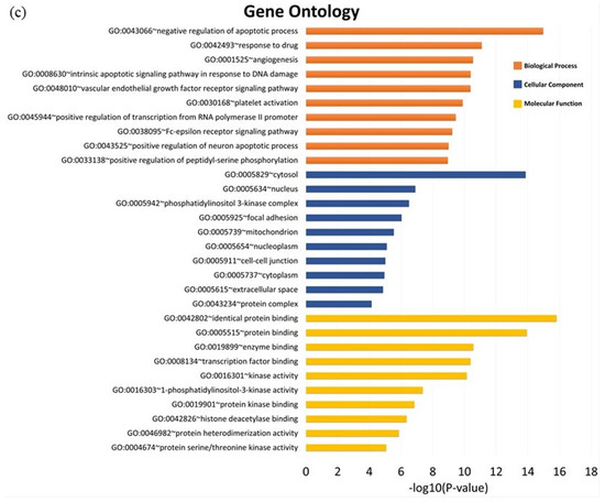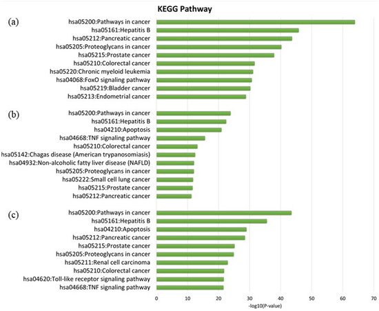 GO enrichment analysis was performed to further investigate the biological process, cellular components, and molecular function of the pancreatic cancer related target of MO and GEM using DAVID bioinformatics resources. The Kyoto Encyclopedia of Genes and Genomes (KEGG) pathway enrichment analysis was also conducted to further reveal the pharmacological mechanism of the combination between MO and GEM against pancreatic cancer. Three intersection networks were investigated to determine the GO and pathway enrichment analysis, i.e., MO + GEM intersection, shared biotargets intersection, and MO intersection networks. The GO enrichment terms and KEGG pathway analysis are illustrated in Figure 4 and Figure 5. The results of GO analysis for the top 10 biological processes among the three intersection networks showed that the negative regulation of the apoptotic process was highly regulated compared to the other processes. In cellular component enrichment analysis, the top 10 significant enrichment terms were mainly involved in the cytosol and nucleus among the three intersection networks. The top 10 significant enrichment terms represented by molecular function showed that protein binding was highly regulated in MO + GEM intersection (Figure 4a), while identical protein binding was highly regulated in shared biotargets (Figure 4b) and MO intersections (Figure 4c). Besides, the KEGG pathway enrichment analysis of the three intersection networks was mainly associated with pathways in cancer and hepatitis B. Among the three networks, pancreatic cancer was one of the related pathways, where it was ranked as third and fourth in the MO + GEM intersection (Figure 5a) and MO intersection (Figure 5c), respectively. However, pancreatic cancer was found in the last rank of the shared biotargets intersection (Figure 5b).