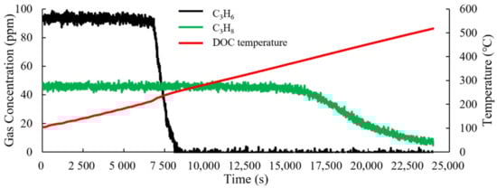 As shown in Figure 5 and Figure 6, the C3H6 concentration in the 0–6103 s time range of test 2 remains stable at around 88 ppm, and the C3H8 concentration remains stable at around 44.3 ppm. During this phase, the DOC temperature is between 104.5 and 218 °C. In the time range of 6103–15,967 s, the concentration of C3H6 decreases from 88 ppm to 0 ppm, while the concentration of C3H8 remains stable around 44.3 ppm. During this phase, the DOC temperature is between 218 and 384.5 °C; the concentration of C3H8 decreases from 44.3 ppm to about 10.9 ppm in the time range of 15,967~23,999s. During this phase, the DOC temperature reaches around 384.5–519.5 °C.