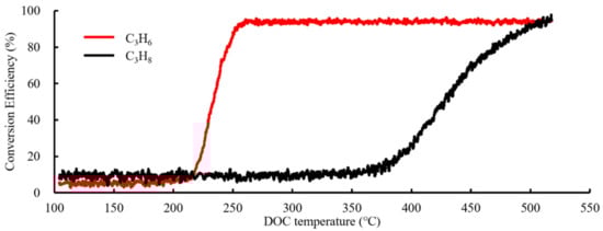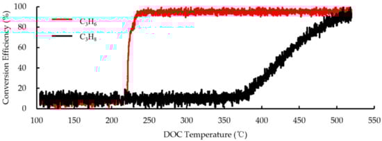 As shown in Figure 3 and Figure 4, the C3H6 concentration in the 0–6800 s time range of experiment 1 remains stable at around 93 ppm, and the C3H8 concentration remains stable at around 46 ppm. During this phase, the DOC temperature is between 104 and 216.5 °C. Within the time range 6800–16,000 s, the concentration of C3H6 decreases from 93 ppm to 0 ppm, while the concentration of C3H8 remains stable around 46 ppm. During this phase, the DOC temperature is between 216.5 and 383.5 °C. Within the time range of 16,000–24,000 s, the C3H8 concentration drops from 46ppm to about 5 ppm, and the DOC temperature during this phase reaches around 383.5–518 °C.