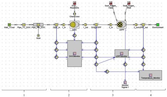 Schematic diagram of the DOC + DPF simulation model. 1. Soot inlet and its pipeline module. 2. DOC_Reactions, DOC and DOCMonitor modules. 3. Soot_Regen_Cake, Soot_Regen_Wall, cDPF and cDPFMonitor modules. 4. Temperature Monitor module.