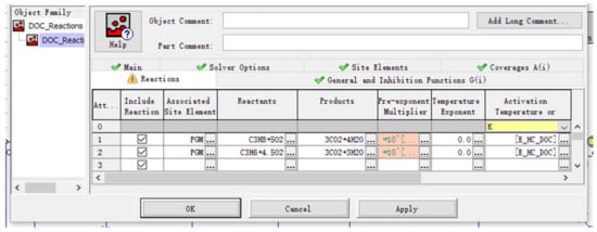 As shown in Equation (6), this paper analyzes the chemical reactions that occur inside DOC and DPF based on the calculation principle of the chemical reaction rate of the oxidation-type catalytic converter proposed by Douglas et al. [28]: