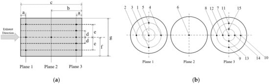 Distribution of monitoring points. (a) Radial view of temperature sensor locations inside DPF. a: 20 mm b: 63.5 mm c: 127 mm d: 31.8 mm e: 63.5 mm f: 95.3 mm g: 190.5 mm. (b) Axial view of temperature sensor locations inside DPF.