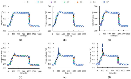 As shown in Figure 11, to simulate the temperature field distribution on the central axis of DPF during the regeneration process, we set up seven temperature simulation points on the DPF axis, which are represented by S1~S7. Simulation point S1 is located at the center of the DPF inlet face, S2 is located 20 mm away from the DPF inlet face, S3 is located 31.8 mm away from the DPF inlet face, and S4 is located 63.5 mm away from the DPF inlet face. S5 is located 95.3 mm away from the DPF inlet face, S6 is located 20 mm away from the DPF outlet face, and S7 is located at the center of the DPF outlet face.