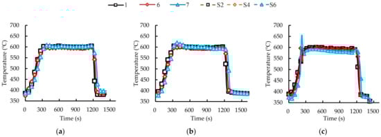 As shown in Figure 10, to validate the influence of the soot loading quantity on the DPF temperature field under regeneration conditions, thermocouple temperature sensors are installed at several locations inside DPF. Three groups of DPFs with different initial soot loading quantities are selected for the experiment. The initial soot loading quantity is 15.5 g (4.28 g L−1), 21.9 g (6.05 g L−1), and 36.5 g (10.08 g L−1).