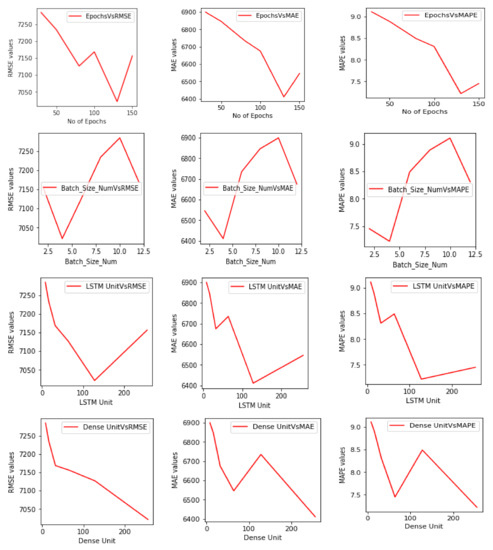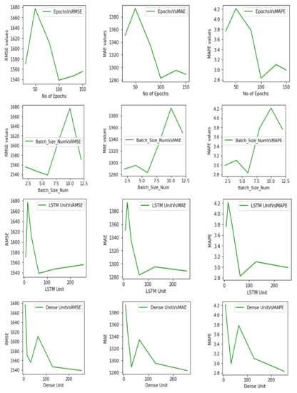 In Figure 3 and Figure 4, the first rows show the number of epochs on the x-axis and performance values on the y-axis. In the United Kingdom case, the network can be observed to have achieved optimum values in 100 epochs, and for Singapore, optimal values have been achieved in 130 epochs. The second rows in both figures show the batch size number on the x-axis and changes in performance measures on the y-axis—the optimal value for Singapore is 4 and is 6 for the United Kingdom. However, the curve for Singapore and the United Kingdom shows a steep increase after batch sizes 4 and 6, respectively, and then a sudden steep decrease after 12. The third rows show the changes in all performance measures versus changes in the LSTM units. For Singapore, after 128 units, there is a steep increase in RMSE values compared to the MAE and MAPE but for the United Kingdom, RMSE increases, however MAE and MAPE values decrease for higher values of LSTM. The last rows in both figures show the number of dense units or hidden units in the dense layer (fully-connected layer) on the x-axis and corresponding changes in RMSE, MAE, and MAPE values on y-axis. In the case of the dense unit for both countries, the best result is obtained at 256 units. However, the United Kingdom graph shows almost the same zigzag curve for all performance metrics compared to Singapore. Hence, in Figure 3 and Figure 4, the best combination of hyper-parameter for Singapore and the United Kingdom are attained through grid search and are (130, 128, 4, 256), (100, 64, 6, 256), respectively. The first values are the number of epochs; the second values are the numbers of LSTM units in the BiLSTM network; the third values show the batch number size, and the last values indicate the number of hidden units in the dense layer.