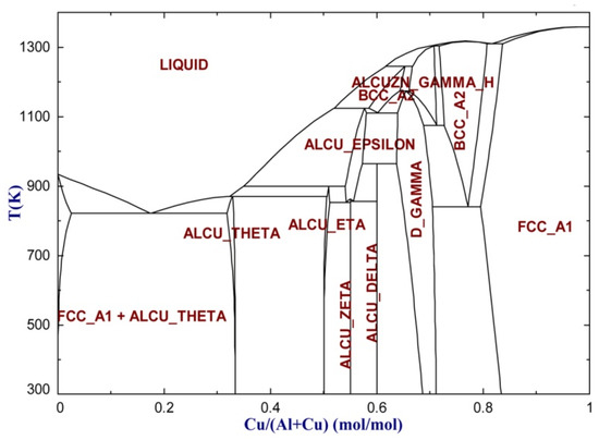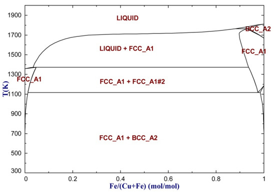 The binary alloy phase diagrams displayed in Figure 2, Figure 3 and Figure 4 were taken from the FactSage 7.3 thermochemical software documentation to illustrate the chemical effect of Cu [32]. The stabiliser effect by Cu is due to its extensive lowering of the Ti liquidus temperature from 1660 °C to as low as 1265 °C at the mol ratio of Ti/(Cu+Ti) = 0.65 at the red arrow in Figure 2. This mol ratio corresponds approximately to that of the MP3 alloy composition in Table 3. The Cu metal powder added to the weld pool serve as stabiliser of Ti in the weld pool by decreasing the temperature required to melt Ti into the weld pool.