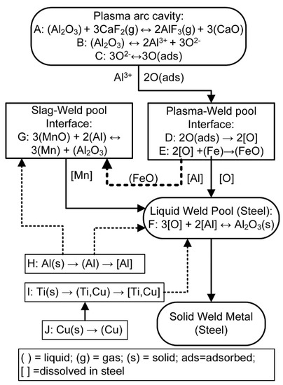 Therefore, our initial SAW reaction flow diagram as illustrated previously, is updated as shown in Figure 6 to include the stabiliser behaviour of copper metal powder [16]. The reaction flow diagram in Figure 6 illustrates the reaction sites and reaction sequence in the SAW process. Reaction steps A to E are as presented from previous works as reported in literature. Al powder added to the weld pool serves to control the oxygen potential at the molten flux-weld pool interface by reducing FeO via reaction (4) in the text, which is similar to reaction G in Figure 6. These reduction reactions are exothermic and release heat from chemical energy into the weld pool to further facilitate melting and dissolution of Ti.