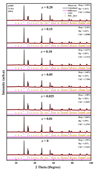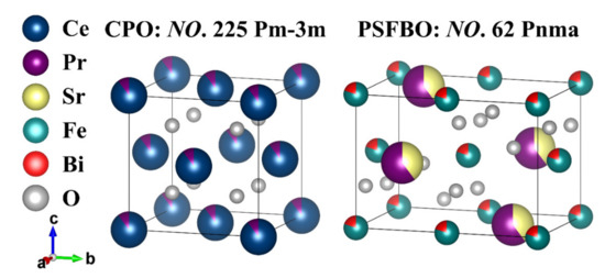 XRD was used to determine the phase structure of 60CPO-40PSF1−xBxO powders, and the results were fitted by FullProf Suite software. Figure 1 shows the XRD patterns of 60CPO-40PSF1−xBxO dual-phase powders. All the powders consist of the CPO phase (space group: Fm-3m, fluorite phase) and PSFBO phase (space group: Pnma, perovskite phase) without any impurity phase. Figure 2 shows the structure models of the two phases, drawn by VESTA software [34]. The perovskite phase is not cubic because of the small tolerance factor. Generally, when the tolerance factor is between 0.79 and 0.90, the phase is orthogonal. As shown in Supplementary Figure S1, as x increases from 0 to 0.20, the tolerance factor decreases from 0.8487 to 0.8122 (calculated with the formula in reference [39]). The tolerance factor far from 1 makes the perovskite phase tend to form an orthogonal structure.